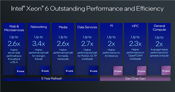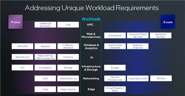 至强6没有采用消费级酷睿P核+E核的异构架构设计,而是分成了两个不同的体系,原因在于服务器、数据中心、网络、边缘等领域的需求是截然不同的。