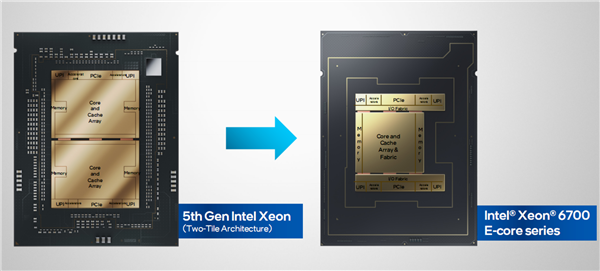 为了分出P核、E核两条路,至强6从底层架构到堆叠封装都做了全新的设计,扩展性更强大、更灵活,因此在核心数量上实现了前所未有的飞跃。
