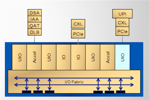 IO模块包含PCIe、UPI、CXL等连接总线控制器,以及DSA、IAA、QAT、DLB等加速器引擎。