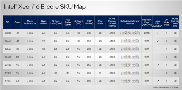 另外,144/96/64核心的四款型号提供超过7年的超长生命周期支持。