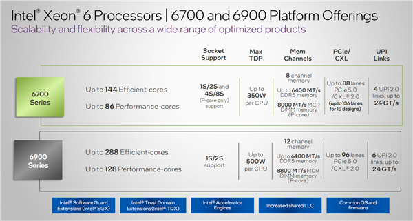 至强6900P最多128核心(256线程),但仅支持单双路并行(单系统最多256核心),内存最高12通道DDR5-8800,并提供最多96条PCIe 5.0/CXL 2.0总线、6条UPI 2.0总线,热设计功耗最高可达500W。
