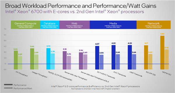 至强6 E核版本替代的是五年左右之前的老平台,比如二代至强,网络与微服务性能提升最多2.6倍,媒体性能提升最多2.6倍,数据服务性能提升最多2.7倍,网络性能提升最多3.4倍,多媒体转码性能提升最多4.2倍。