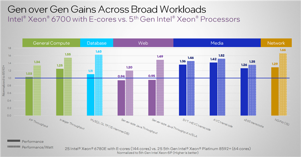 至强6 E核版本对比五代至强的提升。