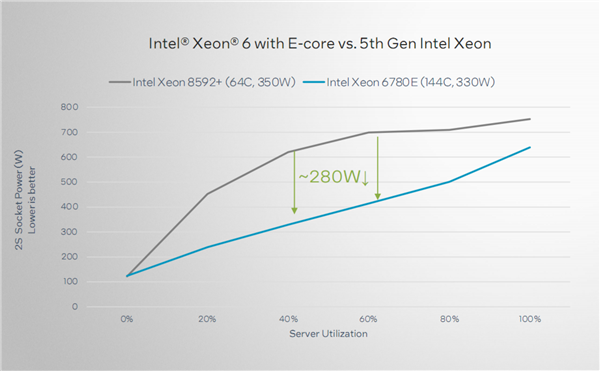 至强6 E核版本对比五代至强的能效提升:综合性能提升18%的同时,40-60%利用率区间的节能效果最好,最多280W。