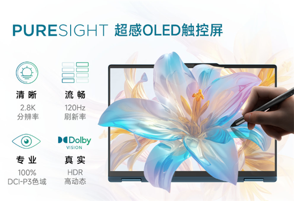 屏幕采用的是一块14英寸2.8K 120Hz的OLED触控屏,亮度400尼特,覆盖100% DCI-P3色域。