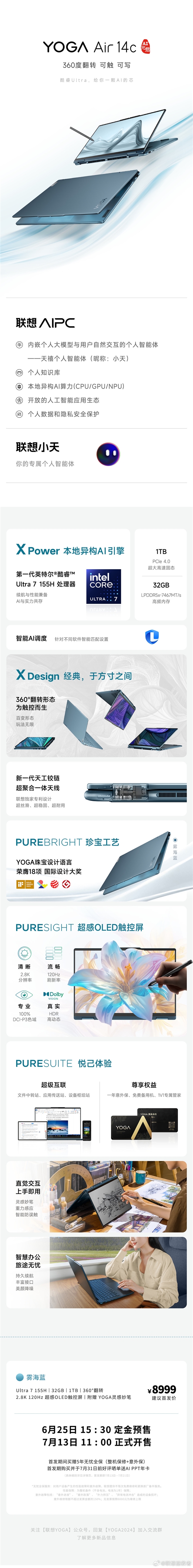 联想YOGA Air 14c AI元启翻转本今日正式发布,首发8999元。