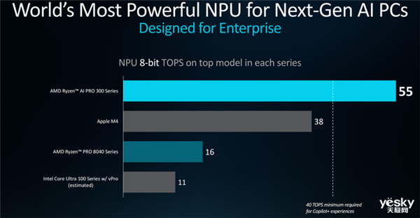 作为面向商用的第三代AI PC处理器,锐龙AI PRO 300系列较上代CPU、GPU与NPU全面升级,特别是NPU算力提升至50-55 TOPS,达到2023年锐龙PRO 7040系列处理器的5倍,支持商用场景下创新的AI应用场景,满足在PC端部署AI的性能需求。