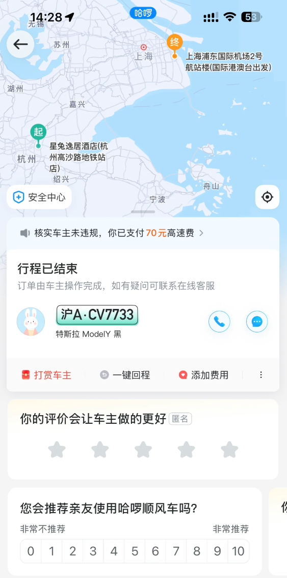 王先生向媒体表示,他是4月11日凌晨在杭州搭乘的顺风车,前往浦东机场,他支付了275元的车费,还单独付了70元的高速费。”