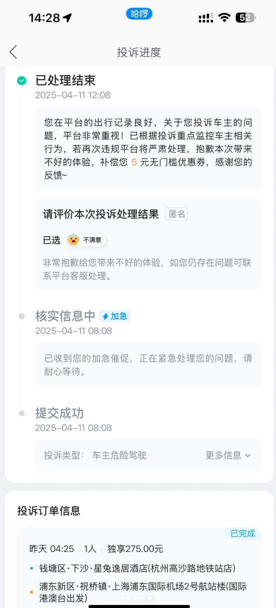 事后,他向顺风车平台投诉司机危险驾驶,平台方的回复为:“已根据投诉重点监控车主相关行为,若再次违规平台将严肃处理,抱歉本次带来不好的体验,补偿您5元无门槛优惠券。”
