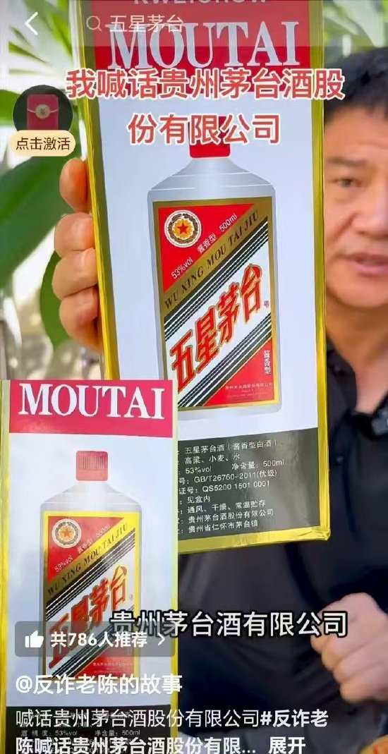日前,网络博主“反诈老陈”发布视频称,自己在某购物直播间购买到了一款包装标注为“五星茅台”的白酒,并喊话贵州茅台(1499.950, 16.95, 1.14%)这“是不是正品”。