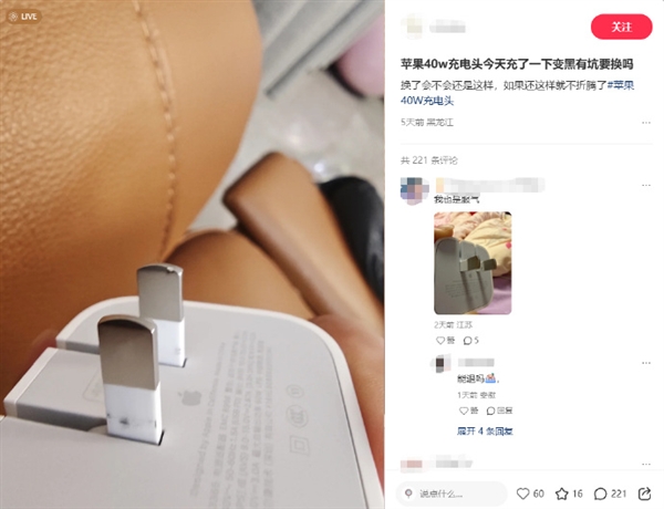 不过,不少用户在社交媒体上反馈,苹果的40W快充头会有“烧接头”现象(图中金属处有“黑点”的部分)。
